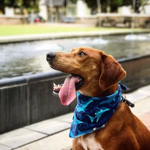Enjoying his puppacino by the fountain in Magnolia Park