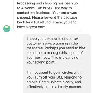 Owner sarcastic saying her products are crap upon arrival