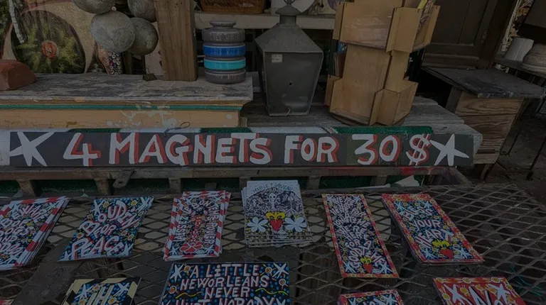 This place is quintessential New Orleans. Local artist who is super friendly, always mingling with customers and always ready to take a picture. His art is famous in New Orleans. I see it all the time at different restaurants and stores and my friends even had him make a piece for their wedding, which all the guests signed. His workshop is open to browse around and chat with him and it's connected to a really neat antique store. My fiancé is French and still lives in Paris, but every time he visits we come to Simon's shop and he remembers my fiancé and they always get to speak a little French with each other. My fiancé brought his best friend to New Orleans for a week and when we stopped here Simon gave his friend a free magnet just for being French. He's just such a great guy and his art is a Nola staple.