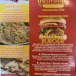Got the #3 Mandela Burger with curry potatoes. The #3 was advertised as being spicy, but I didn't think it was spicy; flavorful yes, spicy no. This was my first time trying a meatless burger, so I wasn't sure what to expect. There were two patties, and to me they tasted kinda like falafel, but with less/different seasoning. They tasted pretty good though, and the burger hit my two critical points - flavorful and not dry - which means it surpassed some beef burgers.The curry potatoes were soggy, which was sad. However, I dislike regular fries, so even soggy I would prefer these curry fries/pirates because they had some flavor.Overall I thought the food, but I wish the potatoes had been crispy - or at least firmer - and that the meal had been $1-$2 cheaper (credit card total $13.13 for burger and potatoes).