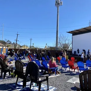 Pandemic Review:This outdoor theater opened in October in response to the pandemic and movie theater restrictions. It's located next door (across the side street) from the Broad. And it's a wonderful (and safer) addition to the neighborhood. The theater has a wide variety of entertainment from sports to movies to live music to a theatrical review. I took my Mom to see the le Petite production of NOLA Noel on December 23rd. And the weather was great... not too chilly for my Mom and a very clear night. The chairs were well spaced and since we had to purchase tickets in advance, the seating was arranged by ticket groups. The seating were adirondack styles some low, some high. We brought a couple of blankets just in case and Mom was happy to have those. There are portolets for bathrooms. And there is a trailer serving snacks and cocktails (a hot apple cider for Mom and hot buttered rum for me). Plus there was a food truck in the parking lot before the show started.The show was really fun and the theater company made great use of the space and some popup tents for costume changes.All staff were wearing masks and patrons were expected to wear them too unless eating and drinking. We were spaced well and it was outdoors so Mom could enjoy some theater!