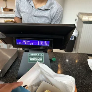 The fudge was a little pricey, but they did have a special where you could Buy 3 and get 1 Free. They were very busy but the cashier was very patient and the Mississippi Mud tasted great as always.
