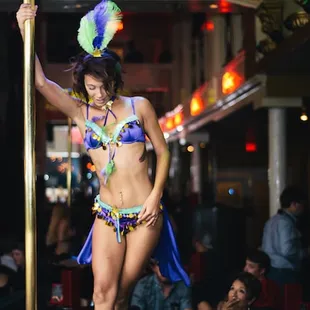 When at Mardi Gras, Mardi Gras all the way! On Fat Tuesday most everything on Bourbon starts to close up at midnight in honor of Ash Wednesday. After some proper exploring of the rest of Bourbon and French Quarter, we were not ready to call it quits yet and found the strip clubs were still open..well then, bring on the bar and the gorgeous ladies! In a female strip club I take my role as crowd enthusiasm enforcer very seriously. I am there to offer the talented and beautiful performers over the top applause, compliments, and encouraging energy. With my body positive and empowering "you gorgeous girl" vibe I hope to offer a little respite from the usual clientele just giving that oh so creepy awkward stare from the corner.Every performer we saw here was over the top gorgeous with incredible athletic talent and impressive agility. It was so much fun how interactive many of them were. They complimented me back while they were on stage, admired my long feather lashes or costume, and performed challenging dance tricks with the patrons gathered around the stage. I liked the overall set up of the room with the different stages, comfy chairs, and bar in the back. I made friends with several other people sitting next to me watching the performers and was happy to see them get into the spirit of respectfully applauding the talent of the ladies performing. Drinks were good and everyone I met here was incredibly nice. As the night came to a close the only thing I wanted that this place didn't have was fries. When the call for fries became too powerful I had to finally call it quits, say goodbye to the lovely dancers, and head off in search for a delicious 3 am Ash Wednesday snacka. This place would be unstoppable with fries..seriously.