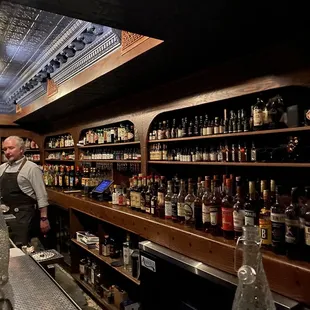 My husband ordered the old fashioned and I ordered the double down. We ended up switching because we liked each other's drinks more! I prefer old fashioneds when they are less straight booze and my husband prefers straight booze.The place is super small but the bartender is very welcoming and helps find spaces for everyone. The drinks are good though slightly pricey ($18 a pop). They give free water and are a friendly cozy spot. Standing only so no reservations required.