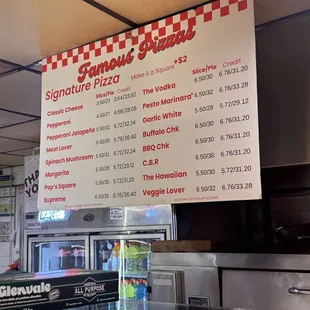 Menu of signature pizza by the slice.