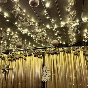 christmas decorations hanging from the ceiling