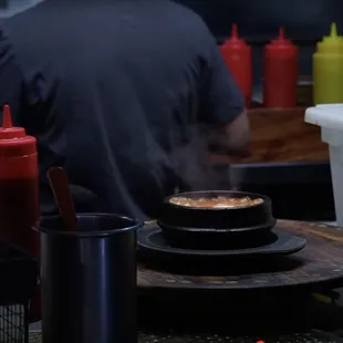 The male employee had a bright & warm smile on his face which felt welcoming as I was getting ready to decide what to get for dinner. It was super hard to choose only one single dish as everything had looked scrumptious from the menu with colorful & accurate-looking food pics + detailed descriptions of all the listed ingredients for each of the food options. The vendor was a small, no-frill looking kind of area just like the rest of the other booths at Food Gallery 32.Typically, seafood + beef + pork are more expensive proteins in comparison to chicken. Tonight, I was craving for chicken especially something hot to warm my stomach since it had gotten a bit chilly & windy after the pouring rain just now not too long ago. So, I ended up choosing the Spicy Soft Tofu Stew w/ Chicken that's served in a Korean 'onggi' (옹기) aka a 'Korean earthenware pot.' The total came out to be roughly around $15. The price range is average for K-Town in general. This particular type of pot is used to serve the stew as a way to keep the temperature of the food hot plus maintain the rich flavors during the whole meal. Then, staff handed me the change, a beeper, and the receipt after paying at the register counter. When the food is ready and/or the beeper starts flashing red lights + vibrating, that's the signal for you to go pick up your meal. Didn't take too long, I would say the prepping and cooking were like 15 mins altogether which wasn't bad at all for a weekday. Of course, it might take slightly longer on the weekends.I looked around for somewhere to sit down and can't wait to start digging in!!! Luckily, I quickly found a seat two steps away from the vendor I'd just ordered from. It was served with a plastic container of steamed white rice and a small banchan (side dish) of bean spouts and thinly sliced fish cakes in a plastic container. Was a bit disappointed not to see the familiar slices of yellow pickled radish being included in each person's meal whether you've ordered a meaty stew or bowl of glass noodles with veggies and/or meat. I began to slurp the soup hungrily and almost burned my tongue from it. There was some spiciness to the soondubu jjigae (spicy soft tofu stew) but it was only a mild to mid-spicy kind of taste in my opinion. Love seeing that vibrant orange color of the piping hot deliciousness bubbling in the black clay pot. I'm so happy that I can really taste the mild to mid-spicy kick from each flavorful sip, the softness and smoothness of the soft tofu rolling around, the tenderness of the boneless chicken pieces, and lastly the softness of the onion slices in between of every bite. Loved that nothing had either tasted too salty or too bland, everything was just right in its own way. And did I ever mention that there was actually lots of chicken pieces from the stew?!? To me, it was definitely so worthwhile to get the delicious spicy soft tofu stew. Can't wait til I go back next time and try other dishes as well from the Korean food court.
