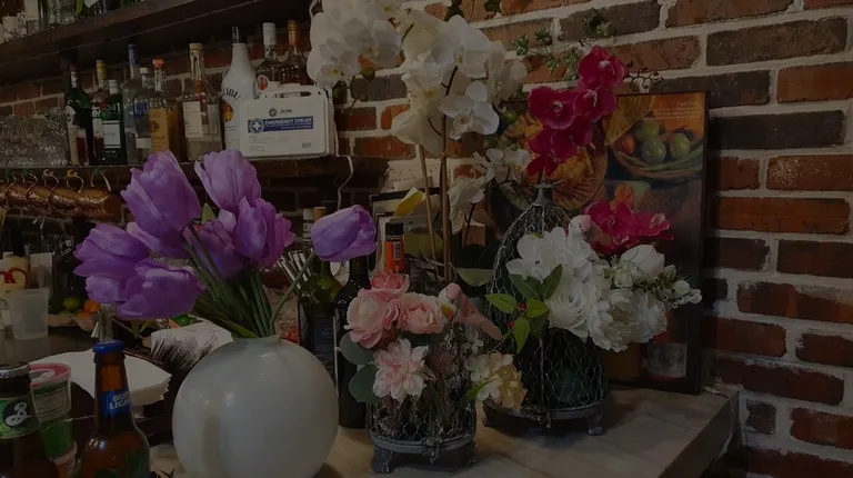 a bar with flowers hanging from the ceiling