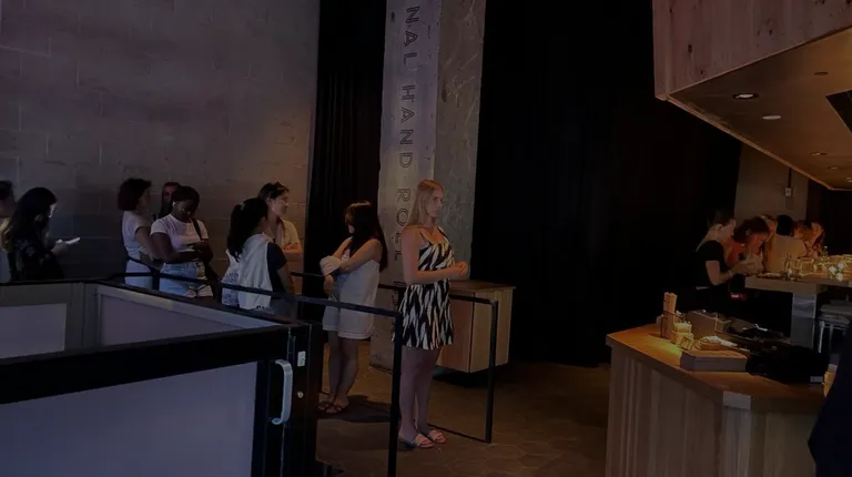 The food and ambience is just OK for me. I feel like you can just get a $3.50 onigiri (rice ball) from a Japanese Supermarket & have a similar experience. This is a nice fast, fancy-but-quick and casual restaurant concept but I didn't find anything special about it or that I would wait in line for. I got the $19 hand roll set (flat rate, no tipping establishment). The set comes with tuna, scallop, and crab. (I overheard that they were out of seabream for the night, but can substitute anything with salmon.) I was in the area around 7:30 PM on a Saturday and noticed that there wasn't any line & went in to take a look. They have a small ramp - good design to accommodate a queue. About five couples, and one group of three were in line ahead of me. The hosts went around, asking how many people everyone had and I was actually seated within a few minutes - between 2 groups of 3 at the front of the restaurant. It's a VERY tight seating arrangement - and I'm petite & very thin, similar sized females on both sides of me. Not sure if this is to encourage fast dining. I don't see many regular-sized adults being comfortable there and you don't have much personal space. The stools are a little bit high, with a foot rest. It would be great if they had a hook underneath the bar for purses or bags. I sat eating with my bag on my lap because I didn't want to put it on the floor. My neighbors had theirs on the floor under their feet. There was literally no space to put a bag between you and the next stool, without that person getting up and stepping on it.My "waiter" greeted me from across the counter, and explained a few specials. It's all a bit awkward & tight and you hear all the conversations (very NYU college crowd). The female chef is right in front of you making all the rolls, quickly filling orders with 2 to 3 waitstaff/hosts crammed behind her.The rolls came out at a nice pace, but the activity behind the counter that you're facing makes everything seem rushed. She she goes down the bar line one-by-one placing them. The rolls themselves were fresh, the seaweed crispy. But I didn't find much seasoning on the rice, the mashed tuna was a bit too mushy for me. The scallop was the best one but lightly dressed in mayo. And the crab was just a (fresh) crab salad with too much mayo. The fresh pickled ginger was a nice contrast between bites. It's funny seeing the people next to me with huge dishes of soy sauce, drowning their rolls in it, and later ginger...The hot rice made half the seaweed soggy and leathery pretty quickly. You have to eat everything fast for that textural contrast. Overall, I found each of the separate ingredients in the hand rolls, fresh but not very flavorful or anything special besides the scallop. The seaweed kind of hides all the flavors because with each bite, it wraps around it like a burrito. I think I'd rather have this as sushi. I was full with the 3 rolls, like a light summer dinner.The restaurant is extremely dark and half of the space is covered with a giant black curtain. It feels a bit like a stage set. There's a door for the restrooms that leads to a back hallway with maybe one or two single restrooms. I saw a short line of people and didn't wait. I don't know if this is just something the hospitality field does, or recent years have brought on stress for workers; but it's really odd when hospitality folks speak in accented English. Later on you hear them speaking to other people in perfect English. Are they playing the role of a foreigner serving guests? Or do they think I'm a foreign tourist, so I don't know any difference in language?Overall, both the food and the space feel like they're trying hard, but only halfway getting there. It's not anything super memorable.