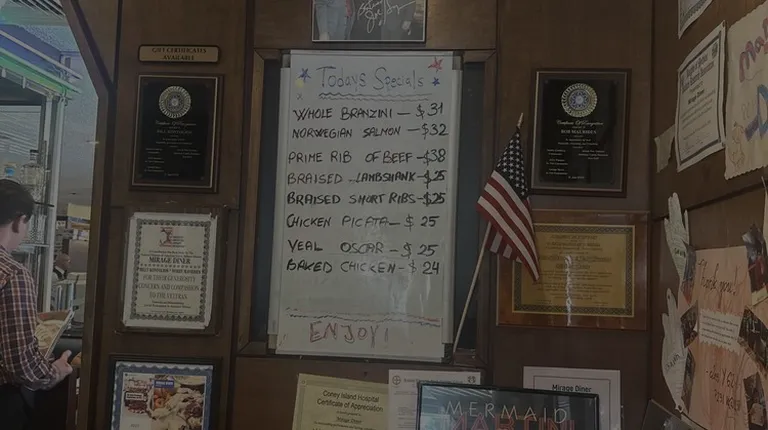 Old school diners which in the 80s and 90s were everywhere have become a dying breed in nyc as more and more close up shop so Ive been looking for a decent diner burger. A basic no frills big cheeseburger with all the usual fixins. Mirage makes a solid burger. I get mine with sauteed mushrooms and swiss. Cooked exactly as i request its a very satisfying burger and comes with good,crispy fries,a couple of onion rings,a pickle and cole slaw. I have also tried that Brooklyn diner fave that you probably couldnt get anywhere else the Chinese Roast Pork sandwich. Roast pork on garlic bread with Chinese mustard and duck sauce. The pork was flavorful if a bit dry. Recently also had the Turkey dinner and for the price (22.95) you got plenty of carved turkey,stuffing,gravy, potato side,veggie side,salad,choice of soup,2 onion rolls and a handful of breadsticks. I kept pulling more out of the bag but....they forgot the cranberry! How can i eat turkey without cranberry??? Well I mean i did and it was good but it couldve been great! The Linzer tart is huge and the Blueberry crumb cake was also really good. This is my new diner go to.