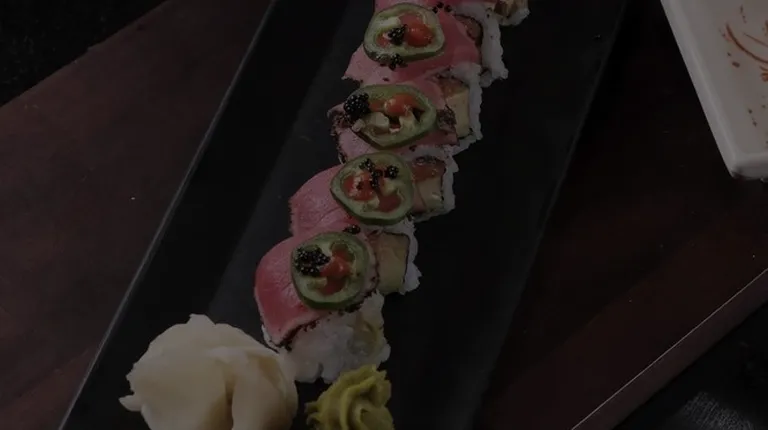 $17.75In - avocado wrapped lobster, salad and white tuna. Top - salmon, yellowtail, tuna, tobiko special yuzu sauce. No rice with soy paper.