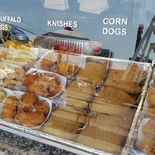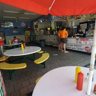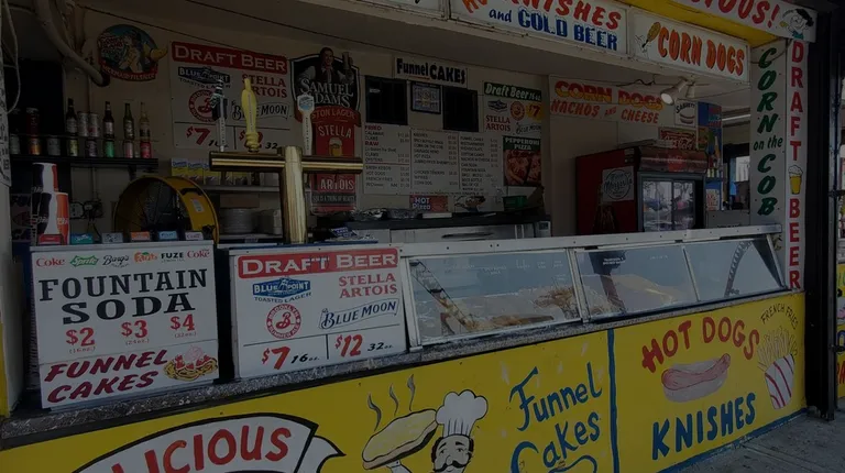 Old school comfort food stand located on the corner across from the Coney Island subway station. This is a spot to get all your fried food and treats in one spot. Fried clams, funnel cake, fried shrimp, grilled meat on a stick, soda, beer, corn dogs, hot dogs, pizza, corn on the cob, knishes, wings, French fries, etc. Small room with some tables to sit at if the normal area weirdos haven't commanded them. Some picnic tables on the outside with umbrellas.Cheap overall and they take credit cards. You don't come here to eat healthy!