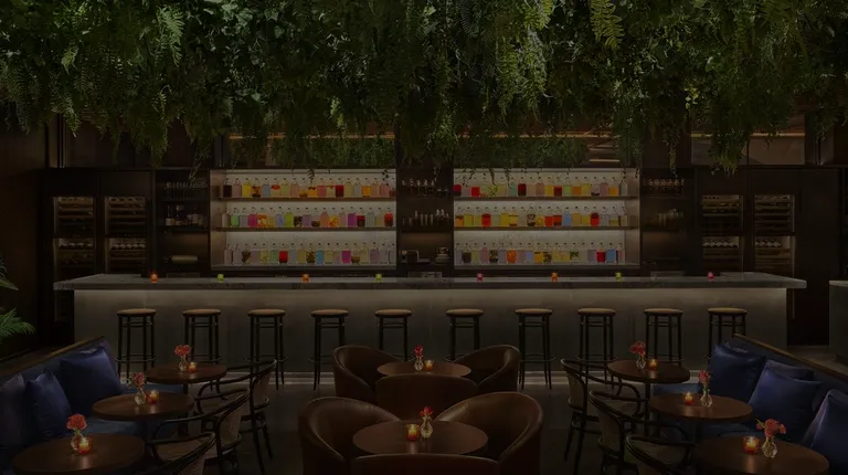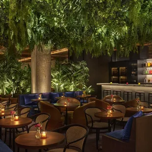 a dimly lit restaurant with potted plants