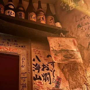 This sake bar is a hidden gem and is located underground. You might miss it walking down the street.I went with a group of 4 on a Friday night around 9 pm and we were seated within 10 minutes. They have a huge selection of sake and the waitress was very informative. We went with a bottle of the Tengumai and it was smooth, earthy and had a pleasant nutty flavor. It was super easy to drink. The ambience is gritty and edgy with years of stickers and writing all over the walls.