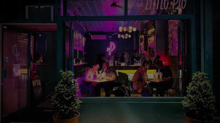 people at a bar with purple lighting