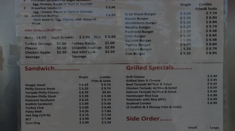 Burgers & fries are delicious, a small fry can feed 2. Not the best location but you can park right in front of walk-up window or go inside & wait. No tables just barstools inside @ counter. No atm only cash/debit. Large menu selection of breakfast, burgers, hotdogs, teriyaki dinners & sandwiches..