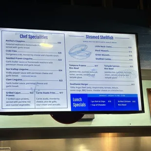 Had the fried calamari, crab garlic bread, fish & chips and clam chowder,Calamari was crispy on the outside with light batter and tender squid inside. Not gummy at all. Seasoned with salt.Clam chowder was pretty good. Little pieces of clams and big pieces of potato chunks in a creamy soup. Not too clammy. The Crab Garlic Bread was good too. Good amount of real crab on top of the cheesy garlic bread. Bread was crunchy toasted. Middle was soft bread. The Fish & Chips had 3 big pieces of flaky fish filets covered with golden brown batter fried crispy outside. Good portion. Battery was nicely seasoned. Fish tasted fresh.Waited 15 min for my food that I took to go. Nice staff. I like that the menu had a big selection from sandwiches to pasta.