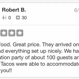 Great food. Great price. They arrived on time and had everything set up nicely. We had a graduation party of about 100 guests and Aztlan Tacos were able to accommodate us. Thank you!!