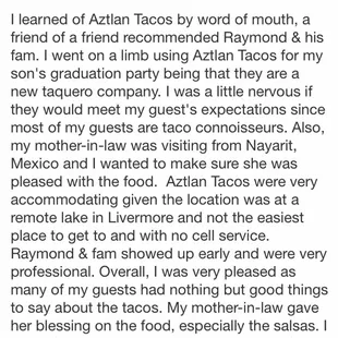 I learned of Aztlan Tacos by word of mouth, a friend of a friend recommended Raymond & his fam. I went on a limb using Aztlan Tacos for my son's graduation party being that they are a new taquero company. I was a little nervous if they would meet my guest's expectations since most of my guests are taco connoisseurs. Also, my mother-in-law was visiting from Nayarit, Mexico and I wanted to make sure she was pleased with the food. Aztlan Tacos were very accommodating given the location was at a remote lake in Livermore and not the easiest place to get to and with no cell service. Raymond & fam showed up early and were very professional. Overall, I was very pleased as many of my guests had nothing but good things to say about the tacos. My mother-in-law gave her blessing on the food, especially the salsas. I will definitely be using Aztlan Tacos again for future events.