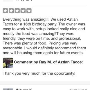 Everything was amazing!!!! We used Aztlan Tacos for a 16th birthday party. The owner was easy to work with, setup looked really nice and mostly the food was amazing!!They were friendly, they were on time, and professional. There was plenty of food. Pricing was very reasonable. I would definitely recommend them and will be using them again for future events.