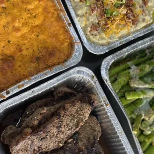 Greens, fried chicken, lemon chicken, crab fried rice, Mac & Cheese and them garlic rolls