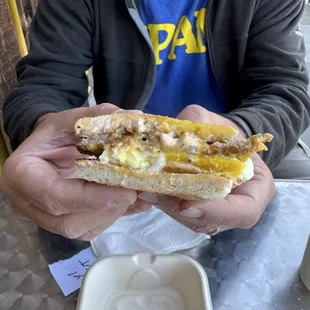 This is the second time i've been here but the first time tasting it. The first time as about a year ago, but when i got home, someone who's pregnant wanted it so i only got to hear how good it was haha. I have been trying to grab another one for a while now but never see them anymore until today while grabbing coffee. they are on 2nd street side now.This is a ridiculously delicious breakfast sandwich. The savoriness with a touch of sweetness to balance it out with the great different textures in a sandwich, this thing is a work of art hidden as just a breakfast sandwich.