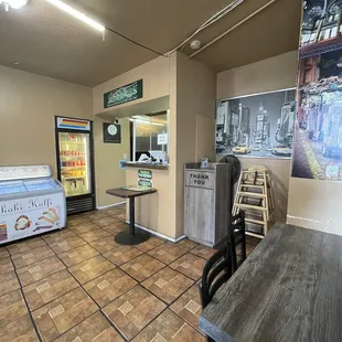 a refridgerator and a table