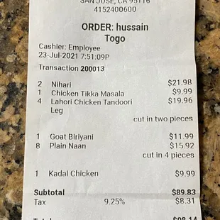 Paiya, Lahori Cholay, Goat Biryani, Beef Seekh Kabab, Chicken Seekh Kabab, plain Naan, plain Lahori Roti. Chai is Free!
