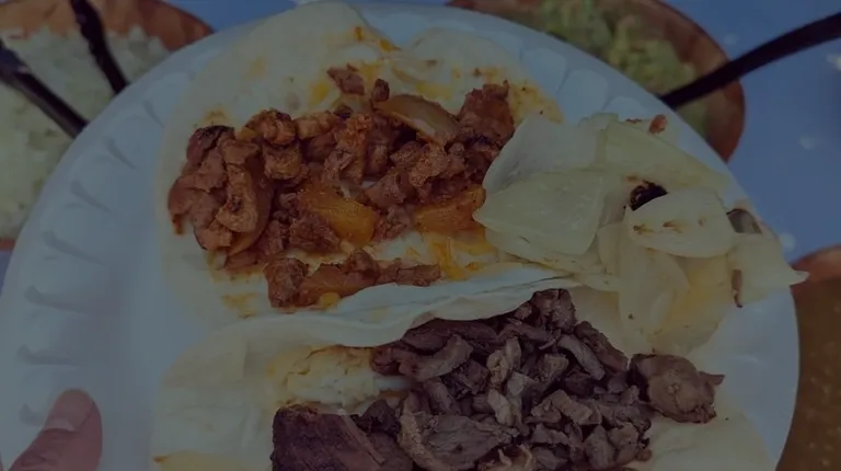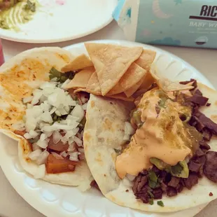 Cilantro, onions, green, red, and chipotle salsas as well as guacamole, chips and cheese (by request).