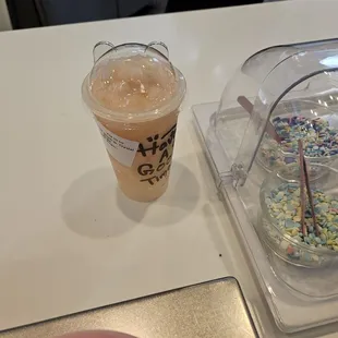 Not sure if this place is new or I've just been passing it by whenever I've comed to the mall. They have such a cute vibe going on, from their artsy figuring ice creams to their drinks. I got their strawberry lemonade with strawberry heart shaped jelly and my daughter got a mango lemonade with mango jelly, both were so good. A little too sweet, but that was my fault I should have adjusted the sweetness level, I couldn't get over the heart shaped jelly they were too cute and delicious. I definitely wanna come back again to try their ice scream and milk teas.