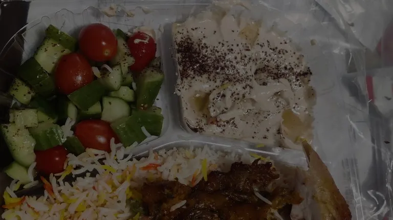 Chicken, hummus, rice & cucumber tomato salad. Food flavorful. Rice like and fluffy, not overcooked. Chicken delish, but I took off star because I wasn't a fan of the hummus. Btw 1 piece of chicken is missing, my son took it. Note: Make sure you get the green sauce, and that the chicken hasn't been sitting too long.