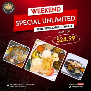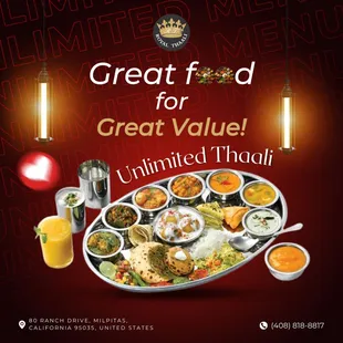 Affordable, infinite amounts of food? Sign me up. Basically, they serve thaali-style meals, which basically just means a meal on a plate with a lot of different things in it. I guess it's not that different from how people refer to bento meals - except it often is a lot fancier due to the sheer diversity of food offered.And this place is no exception! You go in, get seated, and you get a preset meal of basically multiple staples (roti bread, puri bread, etc.), some appetizers, and several curries. What is unusual is that basically whenever you eat any of those and want more of anything in it, you can ask for more. So in short, it's essentially all-you-can-eat.The menu rotates through several themes, usually revolving around a regional cuisine (I think I' remember Marathi food? Punjabi food? Gujarati food?). So what's cool is you actually do get something different depending on what day you go. If you have a strong opinion on what you prefer, you can check their website to see that week's menu.Overall, I do not have a strong opinion and I've liked almost everything I've had here. And even if you don't absolutely love something, you can simply...not request refills of that specific curry.They also basically have complimentary chaas buttermilk. Personally not a fan of chaas, but it's a nice touch!Value is pretty good, especially on weekdays. Honestly one of the cheapest AYCE options I've seen in the Bay Area. Highly recommend if you want to get absolutely stuffed on a tight budget.