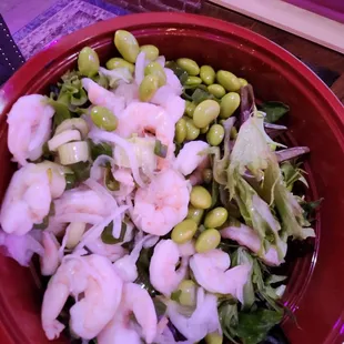 Medium poke bowl with sushi rice (at the bottom) with ahi tuna, salmon, spicy crab, cucumber, edamame and goma wakake (seaweed salad)!