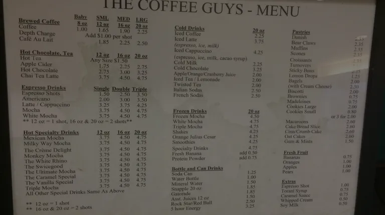 The Coffee Guys is a food cart on the lst floor of Kaiser Hospital. cart just outside of the cafeteria.-offerings: coffee, tea, pastries, sodas, candies, snacks.brew: coffee (sm. 12 0z, 1.85) apfel-slightly bitter, coffee usually found in donut shops.drips:-quick service, nearby front door.