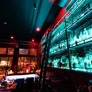 a bar with a lot of bottles and glasses