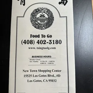 Tsing Tao at 15525 Los Gatos Blvd, Ste D, Los Gatos, CA 95032 is a business that relocated from Campbell, CA.This is a brand new store with major upgrades from the old location. Freshly painted walls, great lighting and new flooring. Restaurant was spotlessly clean.The service was excellent, everyone worked as a team. One thing I really liked was the insulated mugs, which kept the drink ice cold.I feel the food is much better than the old location. The sweet and sour pork was fabulous! Tender, lightly battered, with pineapple, and other items. I like the fried rice, although a bit different than other restaurants. Not greasy and very tasty with lots of scrambled eggs in it. Of course, you can't beat the egg rolls or the hot and sour soup.I saw other dishes being delivered, everything looked marvelous!I HIGHLY RECOMMEND this restaurant!