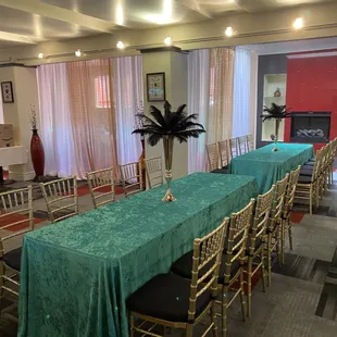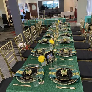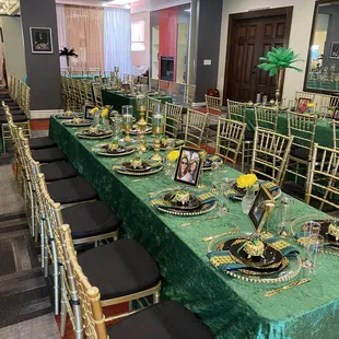 tables and chairs with green tablecloths