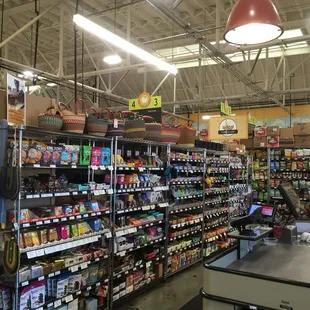 Alameda Natural Grocery is the hippest place to shop for groceries in Alameda. In fact, some peeps come from the "mainland" to shop there. As I entered the store from their parking lot, on the left was a bulletin board with information about music and children. On the right, there was a bakery display case. I couldn't resist getting a large crispy breadstick with seeds, jalapeno and cheese. I also got some chocolate chip, molasses, and oatmeal cookies--they were so delicious I almost ate them all before getting back in my car. They have a fresh fish and meat market where there is a butcher to make those special cuts of meat. Also, the animal products come from animals that are raised humanely. You can actually smell the fish before you buy (who wants to buy old stinky fish?) They have a wide variety of foods for vegans, and people on special diets, too. They steer away from chemically processed foods, including GMO. They have a beautiful selection of organic fruits and vegetables including the largest selection of fresh mushrooms I have seen in the East Bay.They carry just about everything you would expect for a natural food store. Something that surprised me located above their large selection of chocolate bars was some really beautiful large woven baskets. You can see them in my photos.I love coming to this store!