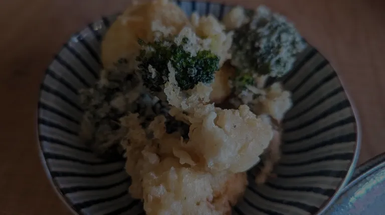 Slow Cooker chicken in yellow curry, with potatoes, deep fried broccoli & rice.