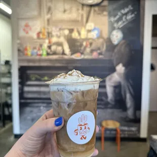 Dulce de leche iced cold brew over oatchata foam and 3 leches foam!