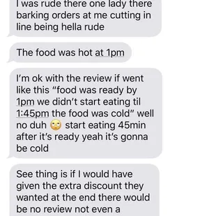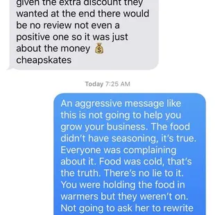 Jimmy was extremely rude. I was google places and he seemed like a decent place to work with. The food was super bland and cold. He wouldn't fix the problem. Then after the fact, he sent me threatening messages out of no where regarding an accurate review placed by someone else. If you don't believe me, look at these messages! Extremely rude and unprofessional work. STAY. AWAY.