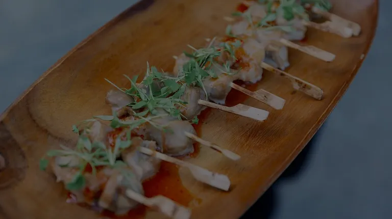 Sesame Seed Bulgogi Chicken Skewer with a kimchi and honey dipping sauces