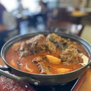Food (4/5)For our party of three, we ordered the haemul pajeon and the Yum So Jungol (spicy goat stew with veggies in hot pot). It was more than enough, we could have done without the seafood pancake. If you ask for rice with your soup, they will make a fried rice with your leftover rice and soup - great ending to the meal. The Yum So Jongol had a lot of meat in it and was perfectly spicy and seasoned. I usually don't like eating too much crown daisy but it was a great accompaniment to the flavor of the stew and goat meat. The Haemul Pajeon was good, but not that crispy. The side dishes were really good and they also did a good job with refills.Price (5/5)Seafood pancake $20.99 and the Yum So Jongol was $47.99, which is really reasonable. It could feed a party of three which is a great deal.Wait Time (4/5)We came here around 130pm on a Sunday and waited ~45 mins. Luckily there's a market in the plaza so we did some browsing. They don't have a notification system so just be mindful of the time and be back before they call your party.Service (4/5)Honestly for Korean ajuumas (no hate!!), their service was very attentive and respectful. We originally were going to order another entree which our server dissuaded against (and thankfully she did). Ambiance (3/5)It's clean but it's more of a casual establishment. There's a wall with takeout containers on one side of the restaurant.Parking/Access (5/5)Located in a strip mall, there's plentiful parking even with the busy market next door.Overall, this is a very authentic Korean restaurant with big portions. I personally likely would not be back often due to the distance and portion size. I also need to be in the right mood for it haha