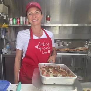 a woman standing in front of a food truck