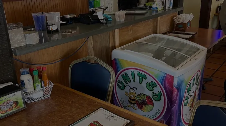 Totally dysfunctional counter for ordering menus are on the way ice cream cooler in the way with condiment spread across the counters