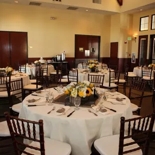 During set up before the wedding: you can see the table set up, chairs and room (architecture)
