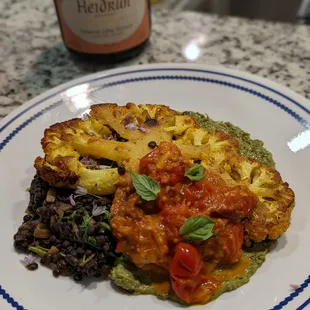 Shwarma Spiced Whole Roasted Cauliflower with Herb Lentil Salad, Quick-Pickled Red Onions, Lemony Tahini Sauce and Spicy Schug Sauce