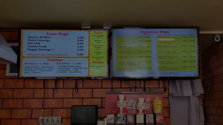 The "Pampered Pup" is a classic hotdog restaurant that has been serving Alameda since 1967. Located on the corner of Park St & Central Ave, this small hotdog joint serves up tasty dogs with speedy friendly service. I was there on a very warm Sunday afternoon around 3pm. I went in and looked over the menu. I tend to order traditional classic dogs, but I like to try something new. So you order the type of hotdog you want, and then the kind of toppings. Or you ask for a Signature Pup, and just pick the type of hotdog. The choices are All Beef, Polish Sausage, Hot Link, Veggie, and Turkey. I got:- Kraut Dog, Polish Sausage (My favorite)- Chicago Dog, All Beef- PupZilla, All BeefAll the hotdogs were juicy and delicious. I was told the PupZilla is a unique recipe of this location. It's a different taste for a hotdog. It has a deep flavor, not spicy, with a sweet finish. Also available are chips, sodas, and lemonade.Limited indoor seating, and some outdoor tables on the sidewalk. This small hotdog place is ideal for a quick meal. If you want coffee, there's Starbucks and a Peet's Coffee right across the street. The Pampered Pup is near the Alameda Theatre, and public parking. It's also near the Kaiser Medical Offices. Located in Alameda's Park Street Business District.Support Local Business!