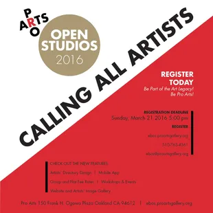 Pro Arts sponsors East Bay Open Studios -- one of the oldest and largest open studio events on the west coast. For two weekends (June 4-5 and 11-12), over 400 leading artists open their studios to the public. A rare opportunity for art aficionados to visit studios, ateliers, galleries and workshops throughout Oakland and the East Bay, it's a vast treasury of art of all kinds, and you get to see how and where it's made (not to mention get great deals direct from the artists!)Plan your tour with a visit to Pro Arts gallery in downtown Oakland, or use the Directory of East Bay Arts (available on line or locations throughout the East Bay). You can even make your own tour suggestions for a Top 3 Must See list, complete with restaurant pairings. Visit Pro Arts gallery on line and on Facebook.www.proartsgallery.org