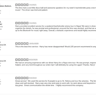 Harry was amazing! He came to pick us up in a beautiful white Limo.We toured the wine country and it was our best day ever!! He was very prompt and at the last minute was able to come 1/2 hour early. He was so kind and respectful. He was inpecably dressed. We truly felt special. We had a tight schedule on our wine tour.. And he got us there on time and in style! Mostly we felt so cared for and safe.. Like a family friend not a chauffeur!! Sitting in the back of the limo drinking champagne we felt like movie stars.. Even our 85 year old momma. We can't recommend Harry highly enough. Anyone looking for amazing transportation for your group look no further!. . Harry and his limo were amazing and his prices are so fair!!